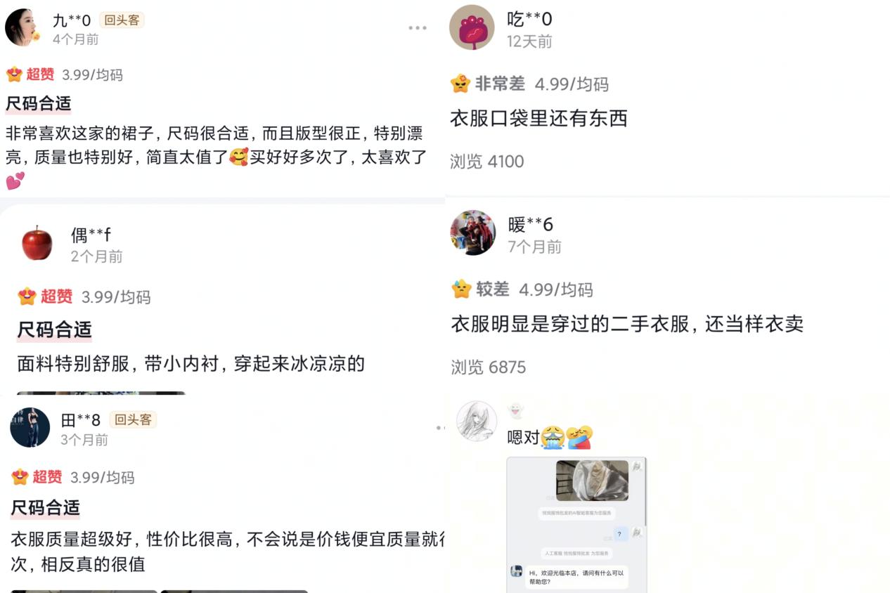 “宣传图是时尚连衣裙,实物却像从年代剧衣柜里拿出来的。”与精美的商品图不同,记者收到的实物多为老旧款,甚至混杂着明显的中老年款式。