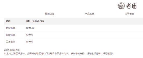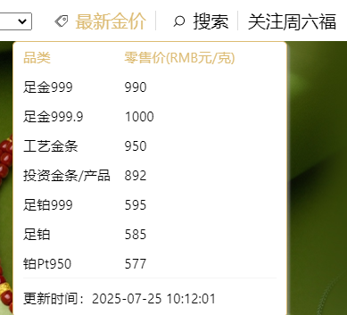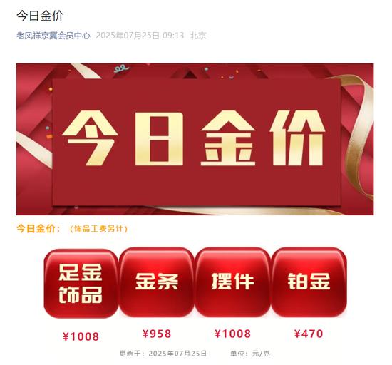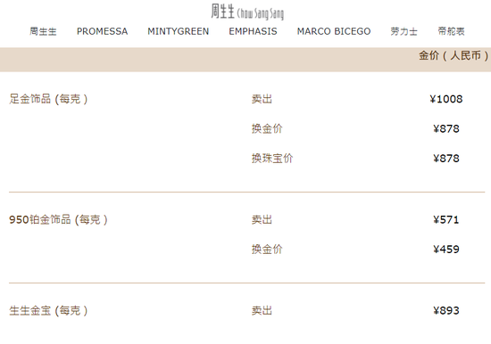 中新经纬查询发现,受此影响,25日国内金饰价格普遍下跌,单克纷纷跌至千元前后。老庙黄金为1004元,两天跌19元;周生生金饰价格为1008元,两天跌了21元;老凤祥为1008元/克,2天跌16元;周大福足金价格为1010元/克,2天跌13元;周六福足金999价格为990元/克,2天跌13元,足金999.9为1000元/克。